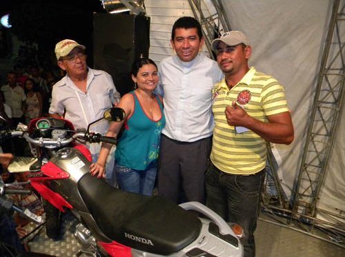 Padre Petrônio e os ganhadores da Moto Honda Bross
