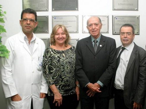 O diretor médico Artur Gomes Neto; a gerente de Ensino e Pesquisa, Alayde Rivera; e o provedor da Santa Casa de Maceió, Humberto Gomes de Melo; ao lado do presidente da Comissão de Residência Médica de Alagoas, Humberto Montoro