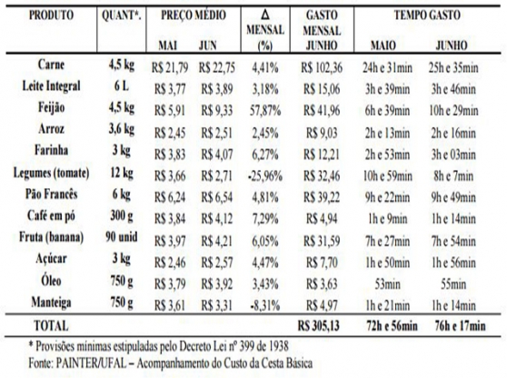 Com este aumento, o trabalhador remunerado com o piso nacional voltou a apresentar redução em seu poder de compra, passando de 36,01% em maio para 37,69% em junho o comprometimento do seu rendimento líquido, deduzida a contribuição à Previdência Social. Assim, o tempo necessário para este trabalhador adquirir a cesta básica aumentou de 72 horas e 54 minutos para 76 horas e 17 minutos.