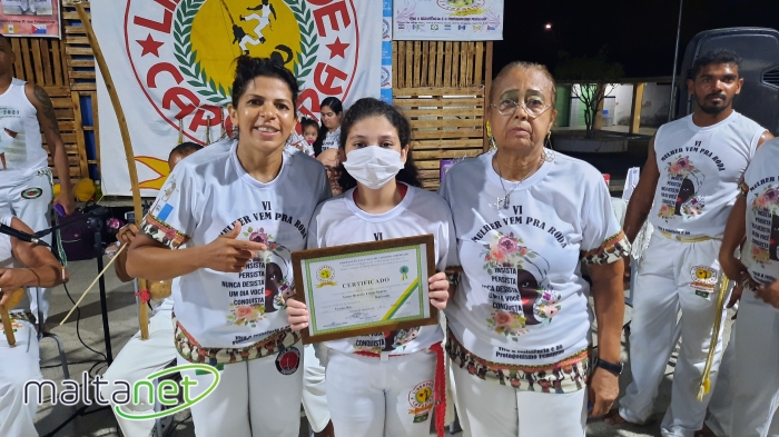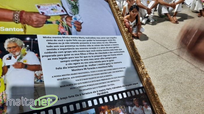 Para expressar a gratidão as capoeiristas monitora Hellyfelete e Monitora 06 (Sirlane) prestaram uma homenagem a Mestra Marly Malvadeza entregando um quadro com uma mensagem especial.