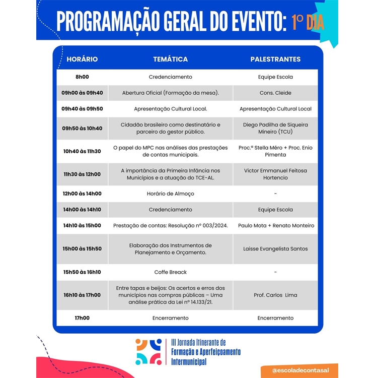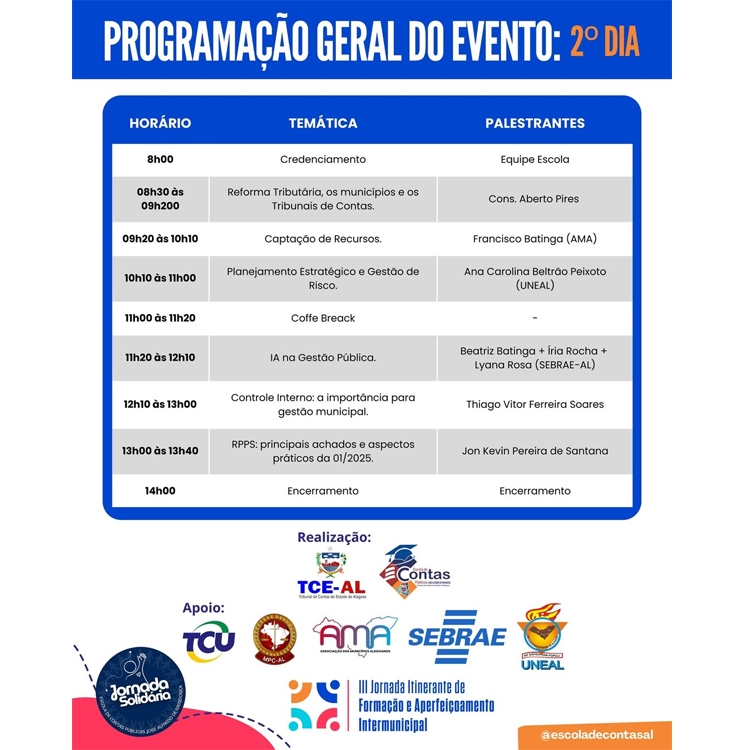 A Escola de Contas Públicas Conselheiro José Alfredo de Mendonça – TCE/AL leva capacitação, cidadania e governança para quatro polos estratégicos de Alagoas: Santana do Ipanema (3 e 4 de setembro), Maragogi (10 e 11 de setembro), Arapiraca (24 e 25 de setembro) e Marechal Deodoro (15 e 16 de outubro).
