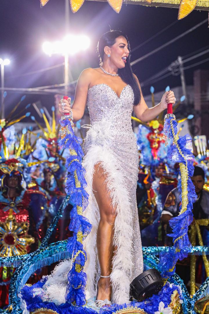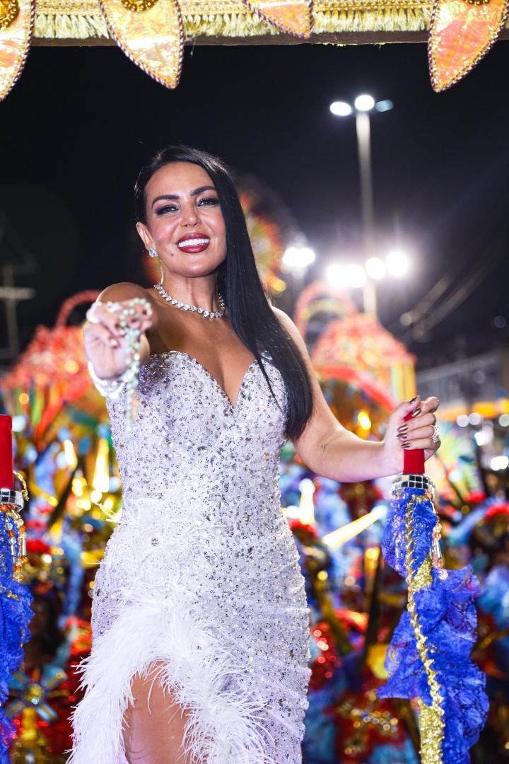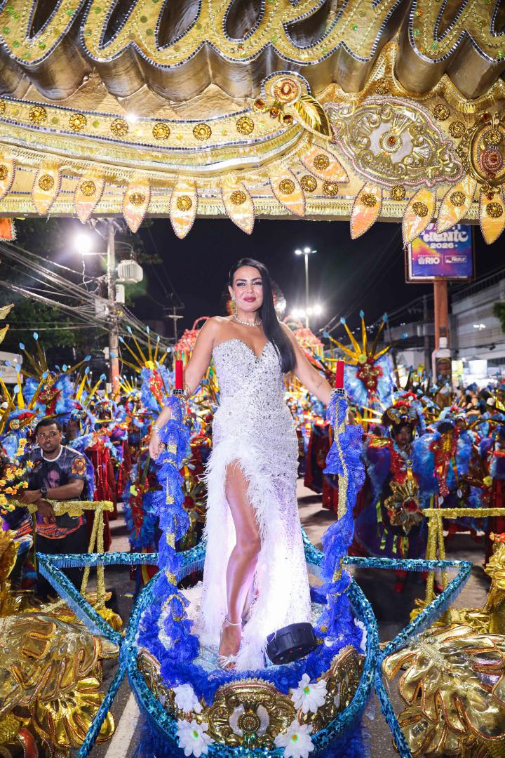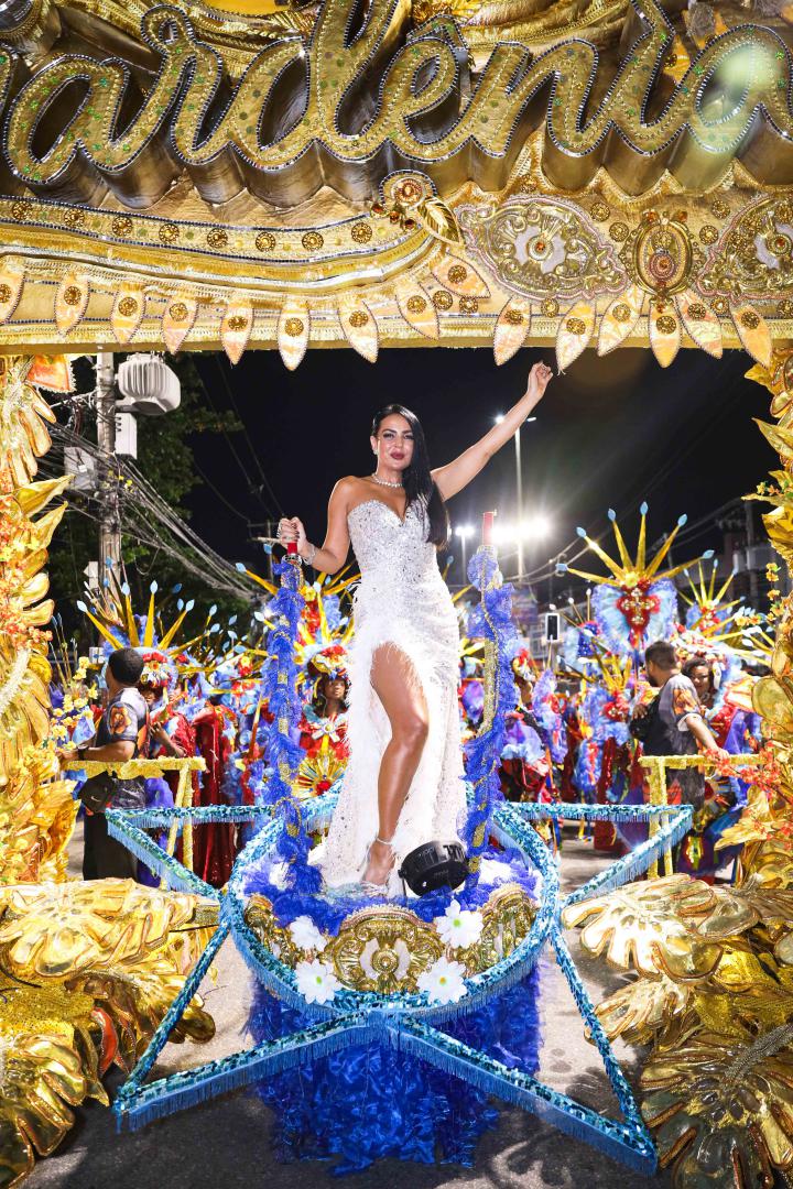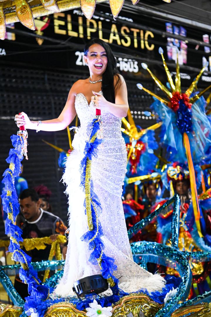 A escola levou à Avenida um desfile marcado por emoção e simbolismo ao narrar a infância no sertão alagoano, os desafios da juventude no Nordeste e a ascensão profissional da homenageada, que é carioca de coração. Gardênia entrou na Avenida como destaque no Tripé de Abertura, projetado como um portal dourado com seu nome em evidência. Vestindo um longo tomara que caia bordado com cristais prata, com fenda lateral e aplicações de plumas brancas, surgiu elevada sobre uma estrela, segurando um terço nas mãos, gesto que reforçou a espiritualidade presente em sua história.