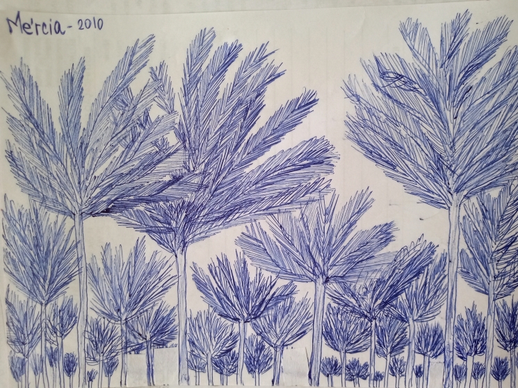 Debaixo da planta deixada por seu finado pai, Seu Tuim, indivíduo cheio de pressas até no falar. O vento na árvore. O ipê cobria Linda de flores roxas.