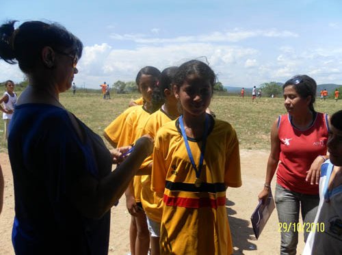 Professora Arlete, Diretora da Escola entregando as medalhas aos vencedores