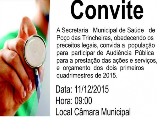 A Secretaria Municipal de Saúde de Poço das Trincheiras, obedecendo os preceitos legais, convida a população para uma audiência pública que acontecerá nesta sexta-feira (11), na Câmara Municipal.