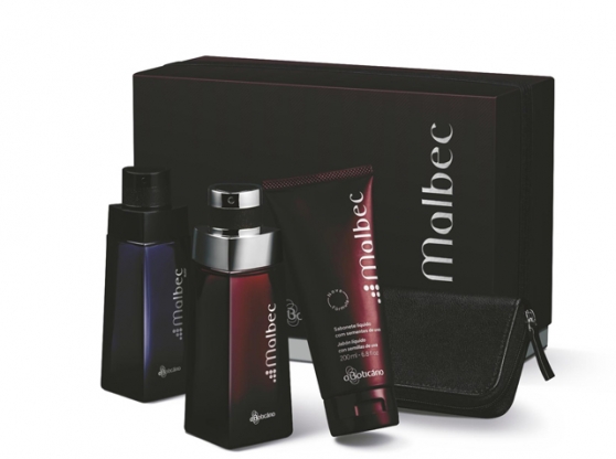 OKit Malbectraz dois desodorantes colônia: Malbec e Malbec Noir, um sabonete líquido com sementes de uva e um kit com ferramentas, todos em uma linda caixa de presente.