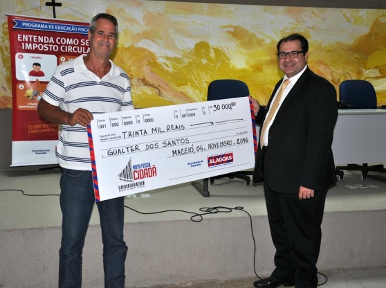 O secretário de Estado da Fazenda de Alagoas, George Santoro, realizou nesta sexta-feira (4) a entrega solene das premiações da Nota Fiscal Cidadã nas duas categorias: pessoa física e instituição social. O evento aconteceu no auditório da Escola Fazendária da Sefaz, em Jacarecica.Durante a solenidade, Santoro agradeceu a presença dos consumidores e representantes das instituições sociais e falou sobre a continuidade da campanha de educação fiscal realizada pelo órgão. ?A gente já percebe o comércio oferecendo mais a opção de colocar o CPF na nota e se adaptando à campanha. É um processo de educação fiscal da sociedade que ajuda na arrecadação do Estado, e melhor que isso: ajuda as pessoas que precisam de apoio social?, destacou.