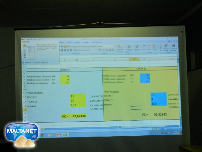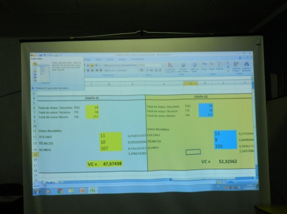 O processo de apuração aconteceu logo após o término da votação e nos dois primeiros segmentos: professores e técnicos aconteceu um empate no número de votos (21), com os seguintes números: Docentes: Chapa 1 (11 votos), Chapa 2 (13 votos) ? Técnicos: Chapa 1 (10 votos), Chapa 2 (08 votos).