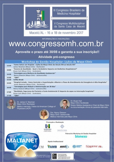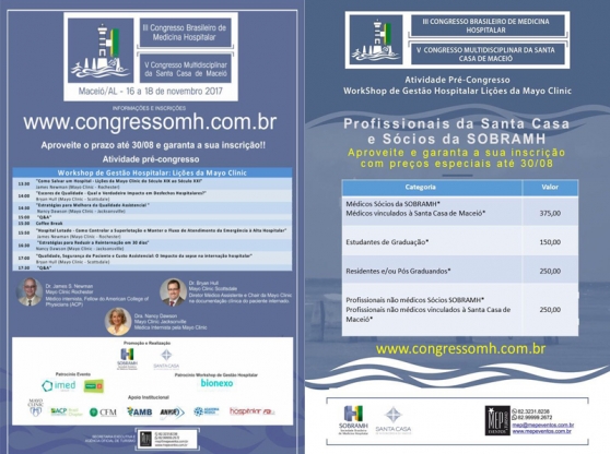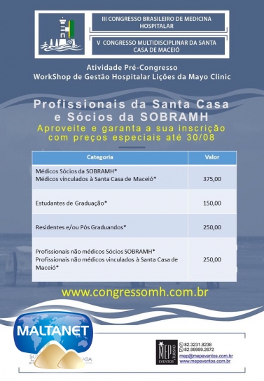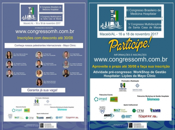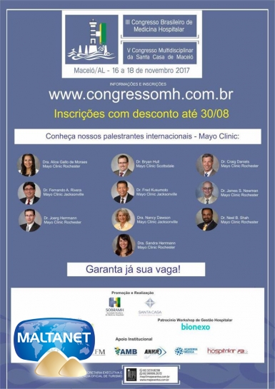 Está chegando ao fim o prazo para submissão de trabalhos científicos para exposição no III Congresso Brasileiro de Medicina Hospitalar. No período de 16 a 18 de novembro, Maceió será a capital nacional da Medicina Hospitalar com a realização do congresso promovido pela Sociedade Brasileira de Medicinal Hospitalar (Sobramh). Simultâneo ao evento, a Santa Casa de Maceió realizará o V Congresso Multidisciplinar da instituição e o grupo americano Mayo Clinic o evento pré-congresso: Workshop Gestão Hospitalar: Lições da Mayo Clinic.