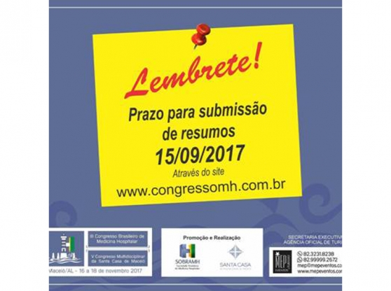 Segundo a comissão organizadora do III Congresso Brasileiro de Medicina Hospitalar as submissões dos trabalhos científicos devem ser realizadas somente pelo site do evento em www.congressomh.com.br. Os trabalhos poderão ser submetidos mediante cadastro no site com os dados do autor como participante inscrito no evento, porém, após a aceitação do mesmo, os autores terão até o dia 15 de outubro de 2017 para a inscrição do autor principal e efetivação do pagamento. As inscrições obedecerão aos valores e prazos vigentes no site do congresso.Será enviado um e-mail acusando o recebimento do trabalho até cinco dias úteis após a inscrição. Caso não receba o email nesse prazo, o autor deverá imediatamente entrar em contato com a Secretaria Executiva do evento através do email e telefones: congressomedicinahospitalar17@gmail.com / (82) 3231.1335 / 3231.8238.