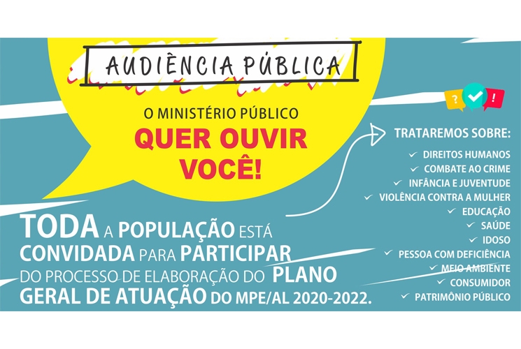 O Ministério Público Estadual de Alagoas (MPE/AL) está preparando o seu plano geral de atuação (PGA) para o triênio 2020/2022 e, para construí-lo, ele quer ouvir a população, de modo que cada cidadão possa sugerir quais são as demandas sociais mais importantes que precisam de uma maior intervenção dos promotores e procuradores de justiça. Os encontros serão realizados nos dias 8, 10 e 11 de abril, em Maceió, Santana do Ipanema e Arapiraca, sempre no horário entre 9h e 13h.