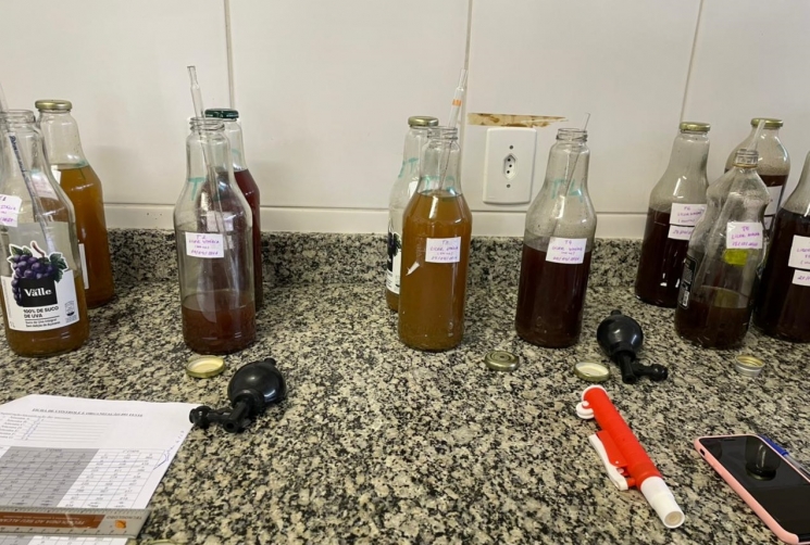 O processo começou ainda em agosto do ano passado, com o cultivo de uvas no parreiral do Campus. Os integrantes do projeto participaram das etapas de manejo da poda, adubação, irrigação, controle de doenças e pragas, monitoramento de brix, colheita, extração de suco, produção do licor, análises físico-químicas, até o teste sensorial.
