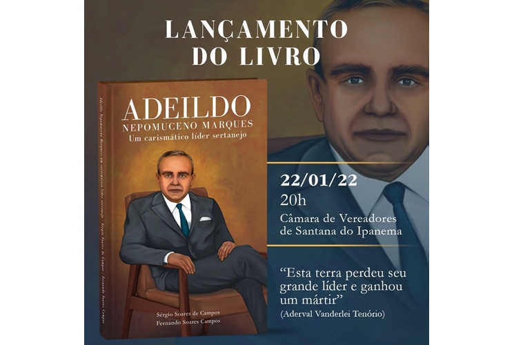 O lançamento do livro “Adeildo Nepomuceno Marques: um carismático líder sertanejo” deverá ocorrer em 22 de janeiro de 2022, a partir das 20h00, na Câmara de Vereadores de Santana do Ipanema - Assessoria Editorial.
