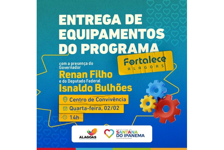 O governador de Alagoas, Renan Filho e o deputado federal Isnaldo Bulhões Junior, entregam nesta quarta-feira (2), equipamentos do Programa Fortalece Alagoas ao povo santanense. A prefeita de Santana do Ipanema, Christiane Bulhões, vereadores, secretários e autoridades estarão presentes na solenidade.