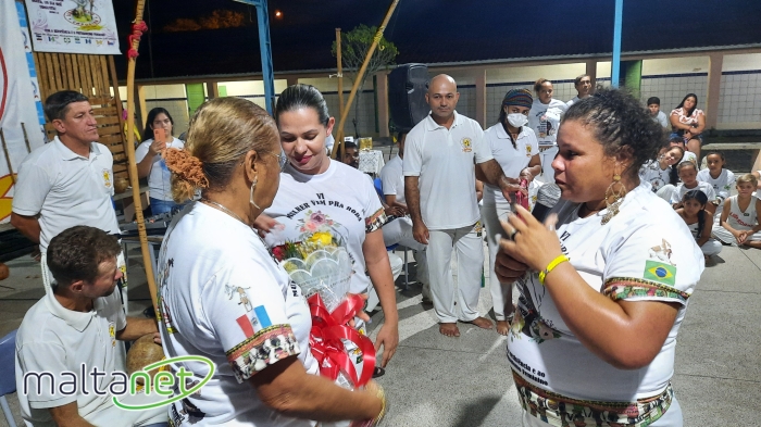 Para expressar a gratidão as capoeiristas monitora Hellyfelete e Monitora 06 (Sirlane) prestaram uma homenagem a Mestra Marly Malvadeza entregando um quadro com uma mensagem especial.