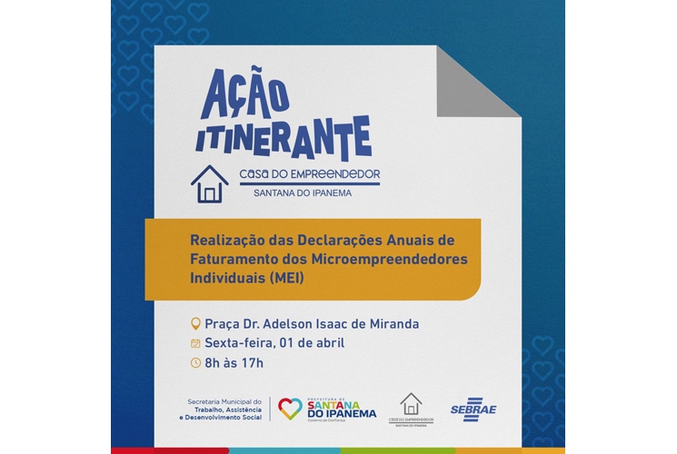 A Prefeitura de Santana do Ipanema, por meio da Casa do Empreendedor, promove nesta sexta-feira (1) uma ação itinerante na Praça Dr. Adelson Isaac de Miranda, das 8h às 17h, para a realização das Declarações Anuais de Faturamento dos Microempreendedores Individuais (MEI).
