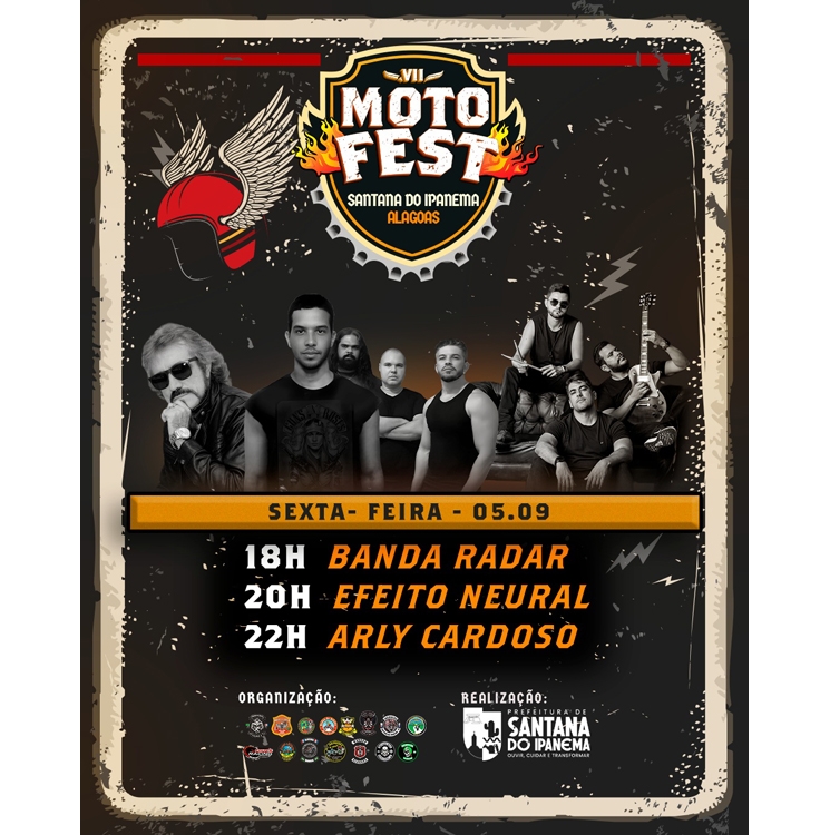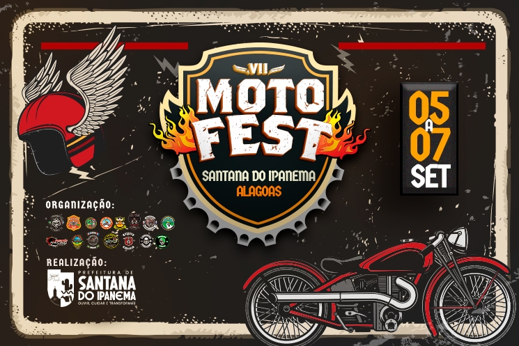 A Prefeitura de Santana do Ipanema divulgou nesta quinta-feira (31), por meio de suas redes sociais, a programação oficial do VII Motofest, que será realizado nos dias 5, 6 e 7 de setembro, no Centro de Convivência, no Largo Cônego José Bulhões.