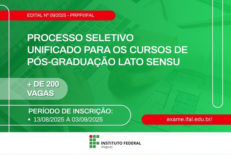 Oportunidade para quem busca um curso de pós-graduação lato sensu gratuito. O Instituto Federal de Alagoas (Ifal) lançou, nesta quinta-feira, 7, o edital nº 09/2025, que oferta 285 vagas para especializações em seis campi da instituição, localizados em cinco municípios alagoanos.