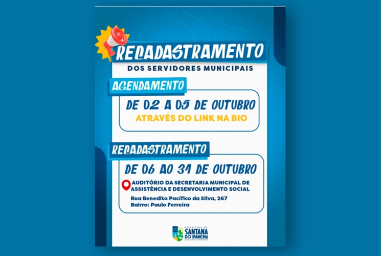 A Prefeitura Municipal de Santana do Ipanema iniciou nesta quinta (2), o agendamento online para o recadastramento obrigatório de todos os servidores públicos municipais.