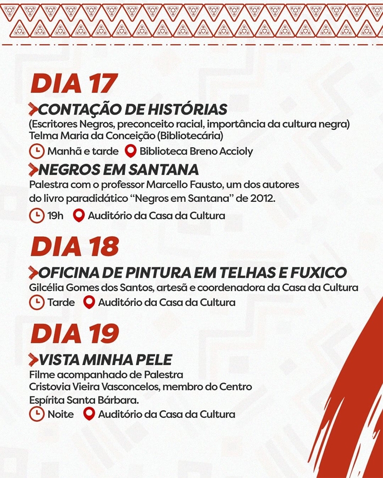 À noite, acontece a palestra “Negros em Santana”, no auditório da Casa da Cultura, com o professor Marcello Fausto, trazendo reflexões importantes sobre a presença e contribuição do povo negro na história do nosso município.