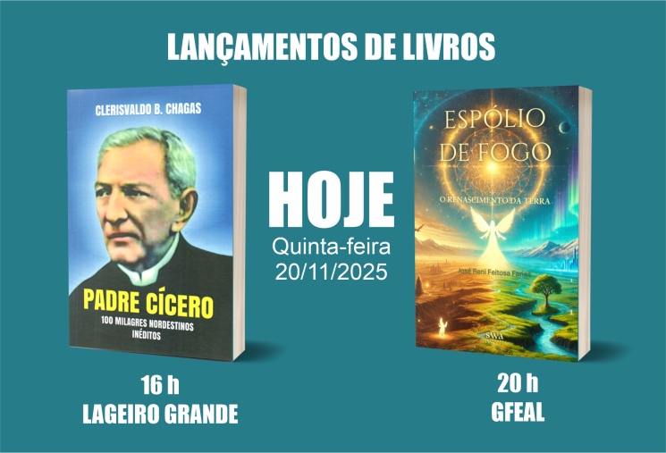 A tarde, a partir das 16 h na comunidade Lageiro Grande, o professor, historiador e romancista Clerisvaldo B. Chagas lançará o livro "PADRE CÍCERO 100 MILAGRES NORDESTINOS INÉDITOS".