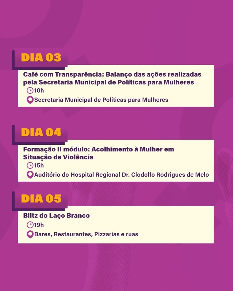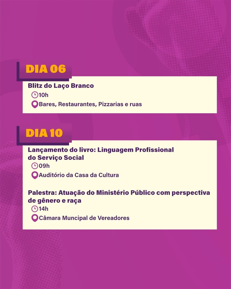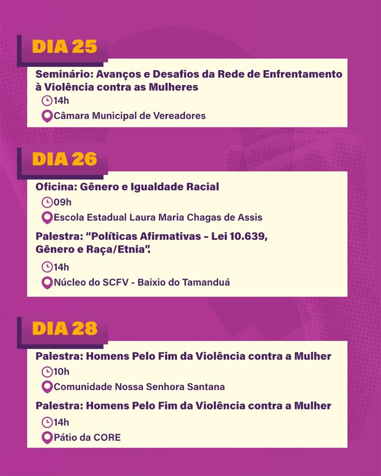 Serão realizados seminários, oficinas, debates, filmes, palestras e atividades educativas que ampliam o diálogo e fortalecem a nossa rede de enfrentamento à violência. ????