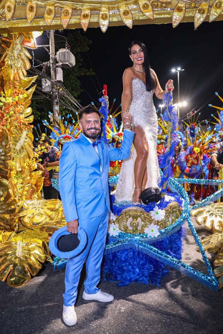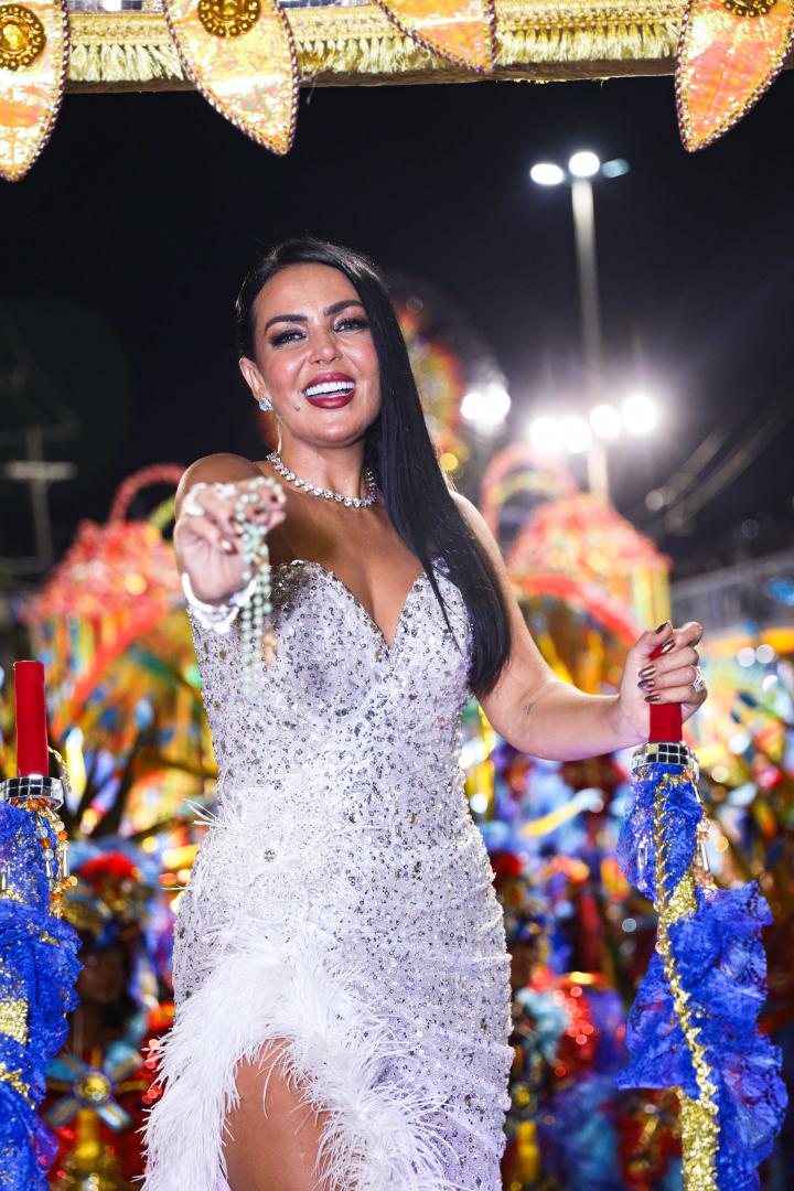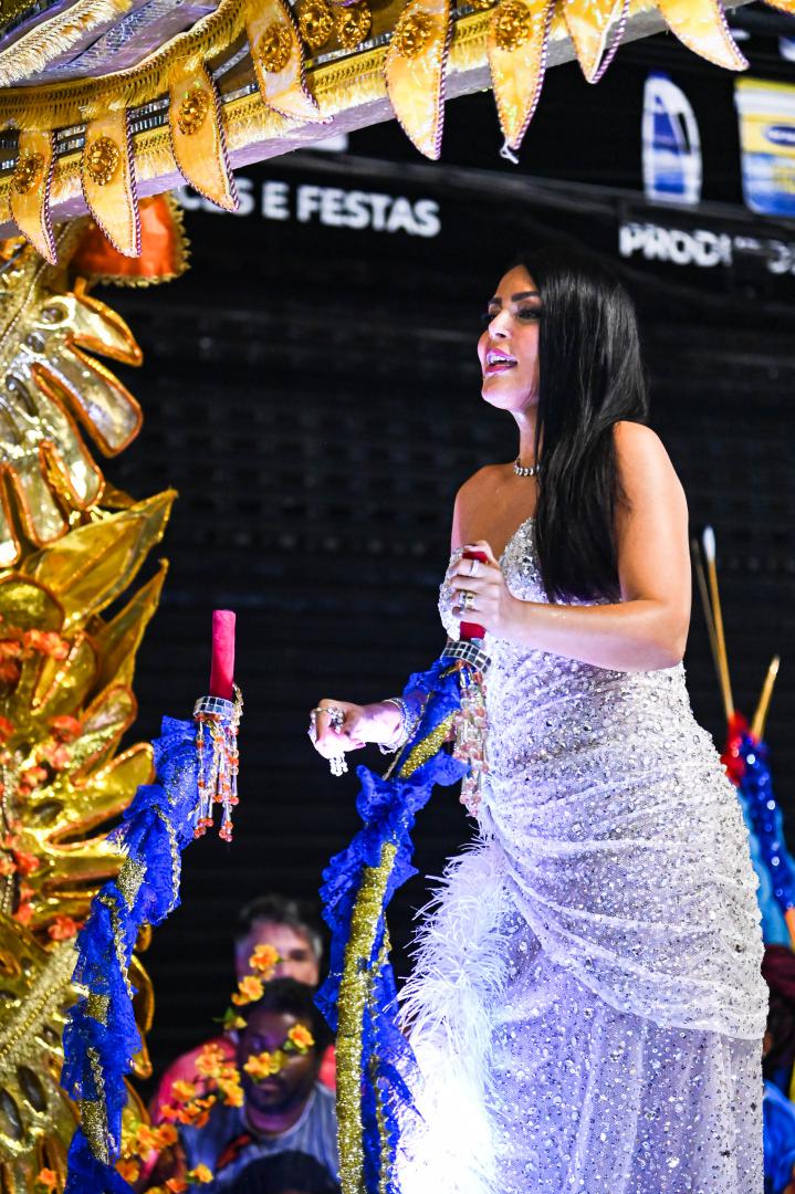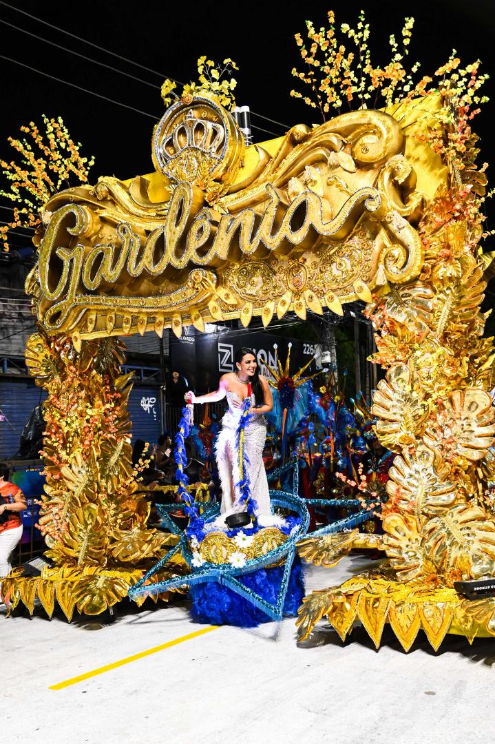 A escola levou à Avenida um desfile marcado por emoção e simbolismo ao narrar a infância no sertão alagoano, os desafios da juventude no Nordeste e a ascensão profissional da homenageada, que é carioca de coração. Gardênia entrou na Avenida como destaque no Tripé de Abertura, projetado como um portal dourado com seu nome em evidência. Vestindo um longo tomara que caia bordado com cristais prata, com fenda lateral e aplicações de plumas brancas, surgiu elevada sobre uma estrela, segurando um terço nas mãos, gesto que reforçou a espiritualidade presente em sua história.