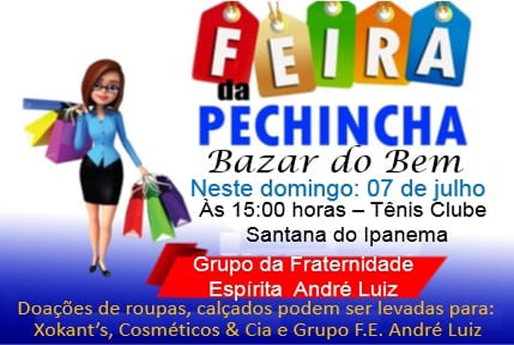 O Grupo de Fraternidade Espírita André Luiz realizará no próximo domingo (07) no Tênis Club Santanense a Feira da Pechincha e o Bazar do Bem com a venda de produtos a preços simbólicos.
