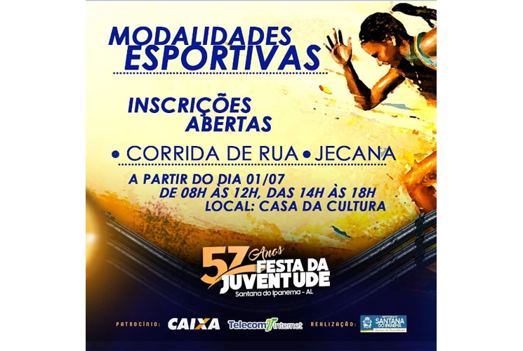 Estão abertas desde a última segunda-feira (01) as inscrições para os interessados em participarem das provas de Corrida de Rua e Jecana da 57ª Festa da Juventude – A maior festa jovem do Estado de Alagoas.