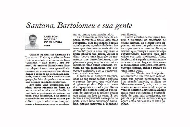 uando aportei em Santana do Ipanema, cidade que não conheço – eis a verdade -, a bordo do livro “Santana – Sua gente… seu humor”, do escritor Bartolomeu Barros, deparei com uma quantidade enorme de personagens que difundiram o segredo da verdadeira humildade e bucólica congregação feita daqueles momentos que deixam saudades fraternas.