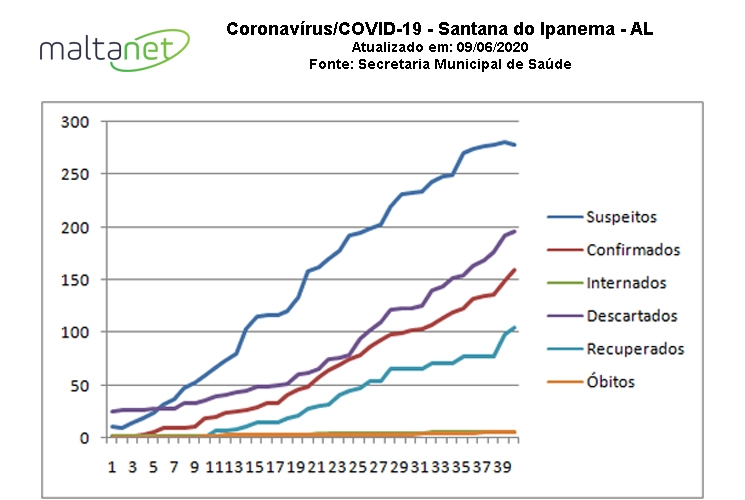 Os demais números do boletim epidemiológico publicado nesta terça-feira (09) pela Prefeitura Municipal de Santana do Ipanema, por meio da Secretaria Municipal de Saúde são: 160 casos confirmados, 196 descartados, 105 recuperados e 5 óbitos.