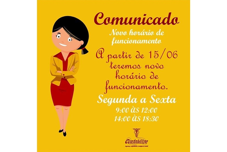 A partir desta segunda-feira (15) o Escritório de contabilidade CONTABILIZE tem novo horário de funcionamento.
