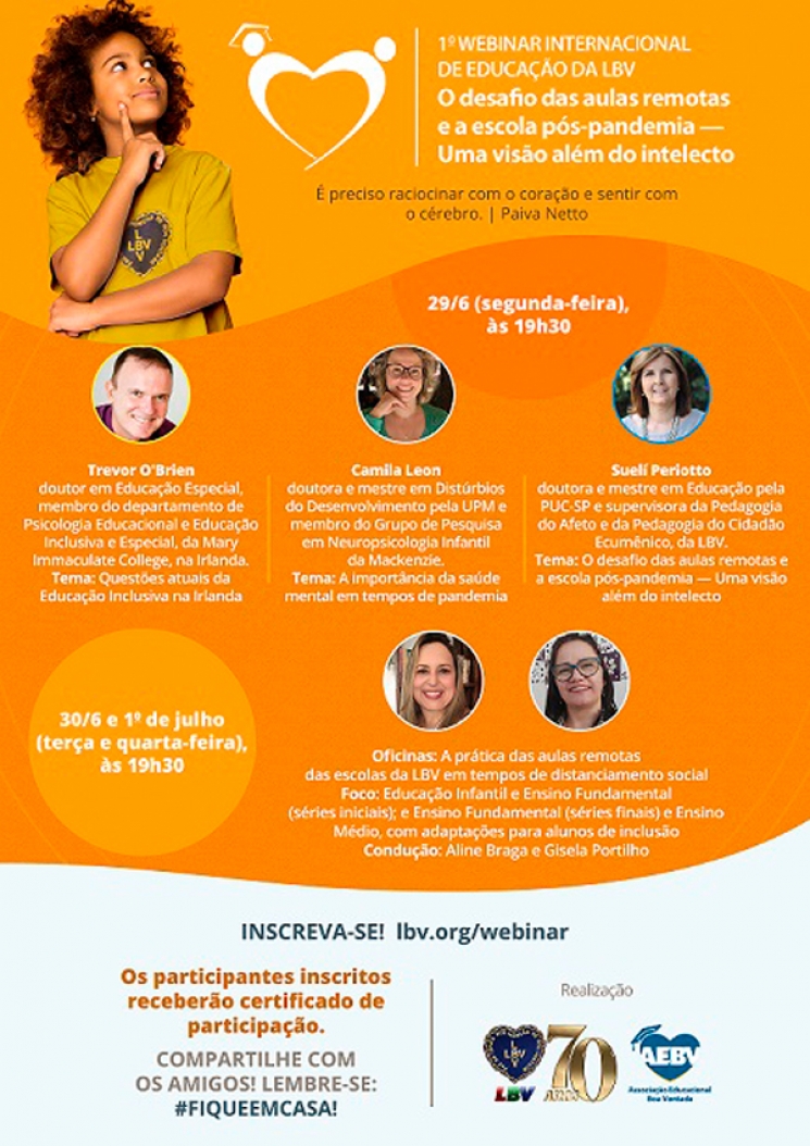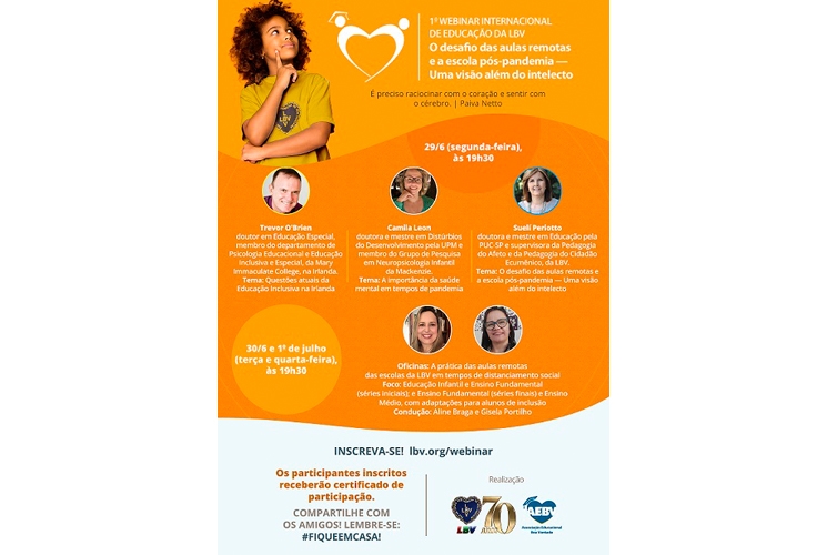 “O desafio das aulas remotas e a escola pós-pandemia — Uma visão além do intelecto” é o tema do 22º Congresso Internacional de Educação da LBV, que ocorrerá nos próximos dias 29 e 30 de junho e 1º de julho, às 19h30. Em virtude da necessidade de distanciamento social, o evento, que anualmente reúne presencialmente públicos do Brasil e do exterior, neste ano terá formato de Webinar.