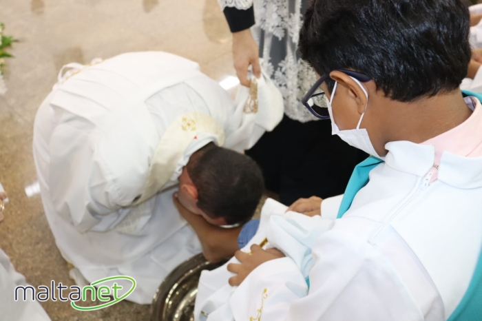 O Padre Jacyel Soares Maciel repetiu o gesto de Nosso Senhor Jesus Cristo lavando os pés de 12 jovens que representaram os apóstolos.